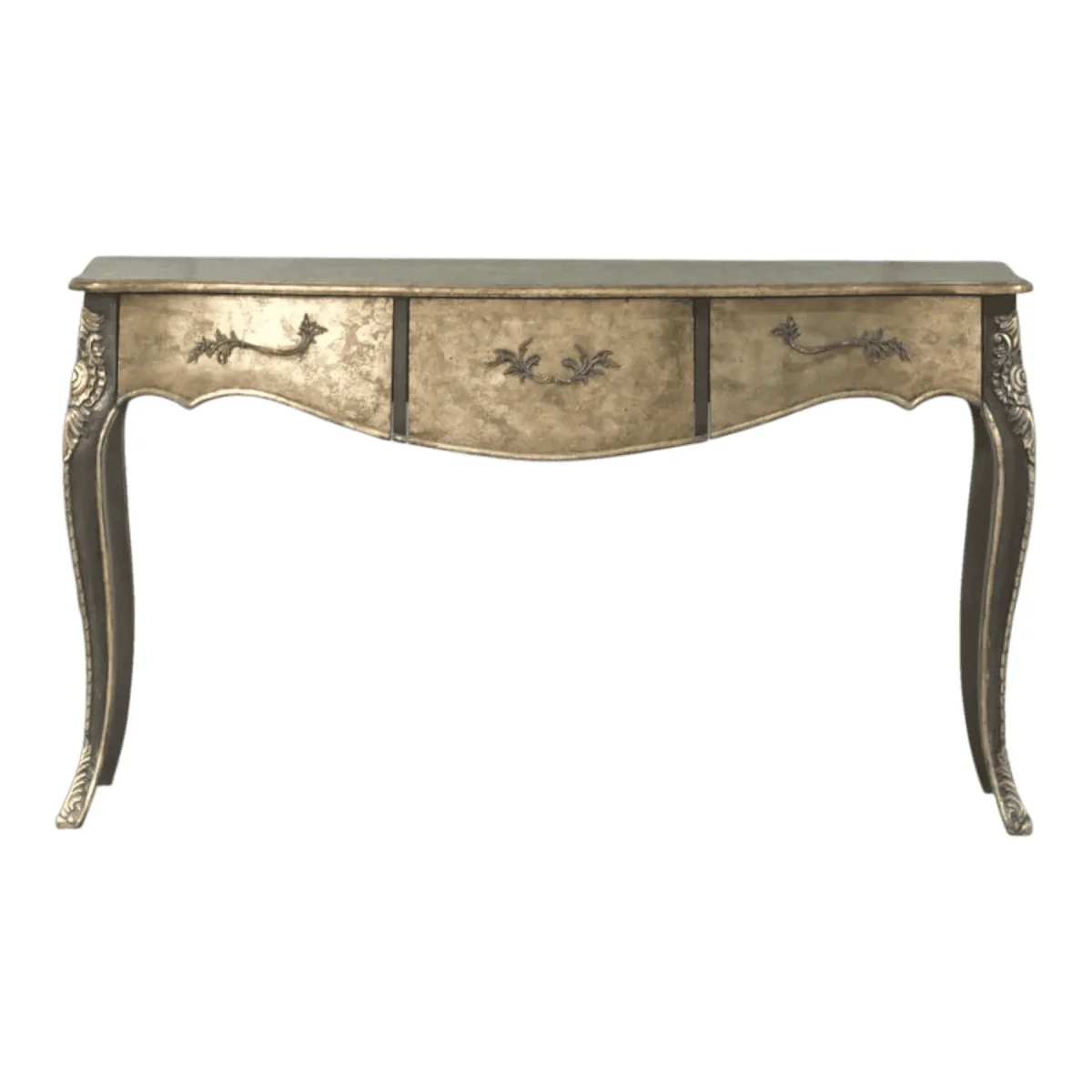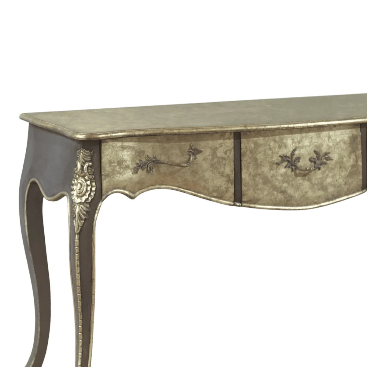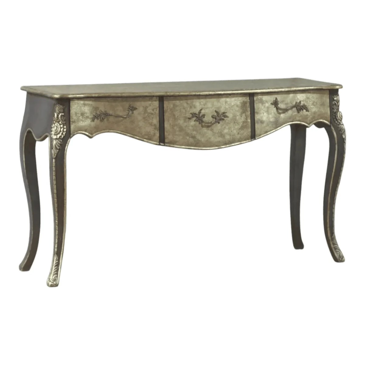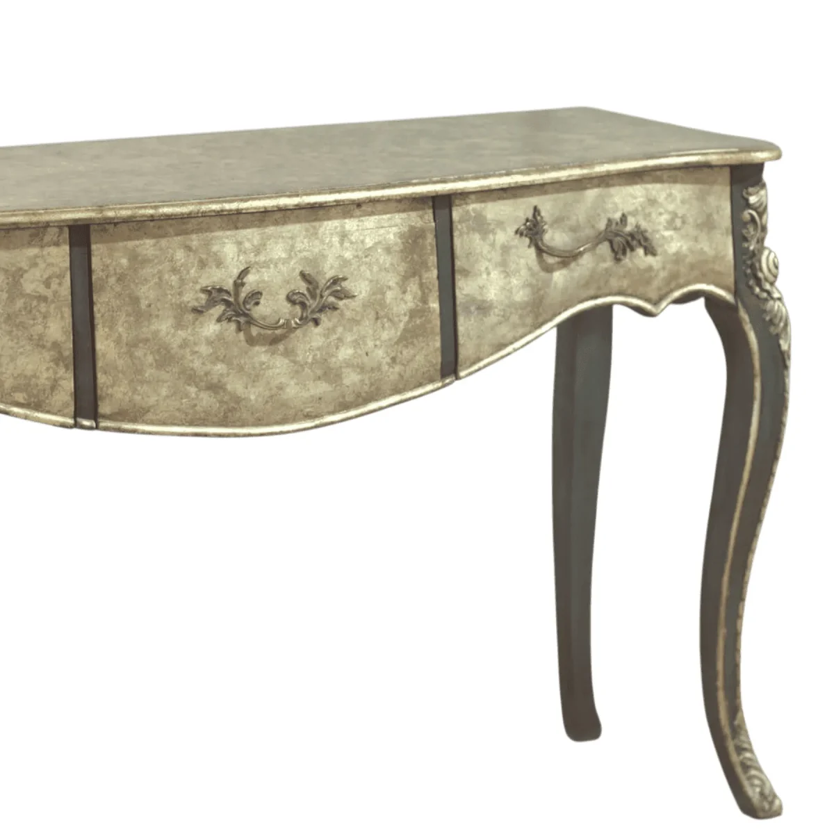 Envelop your living space in the romantic allure of a forgotten era with this stunningly crafted console table that features a distinctive scalloped apron and curvaceous cabriole legs The surface treatment is a masterclass in texture boasting a distressed silver leaf finish that allows hints of the underlying mahogany to peek through like a cherished heirloom discovered in a Parisian attic This piece serves as a bridge between rustic farmhouse charm and high-society elegance making it a versatile addition to hallways or behind a sofa Each curve is hand-sculpted to ensure a fluid silhouette that catches the light from every angle providing a soft glow to your interior design scheme Built with the integrity of heartwood this table offers both a sturdy platform for your favorite decor and a poetic statement of timeless craftsmanship